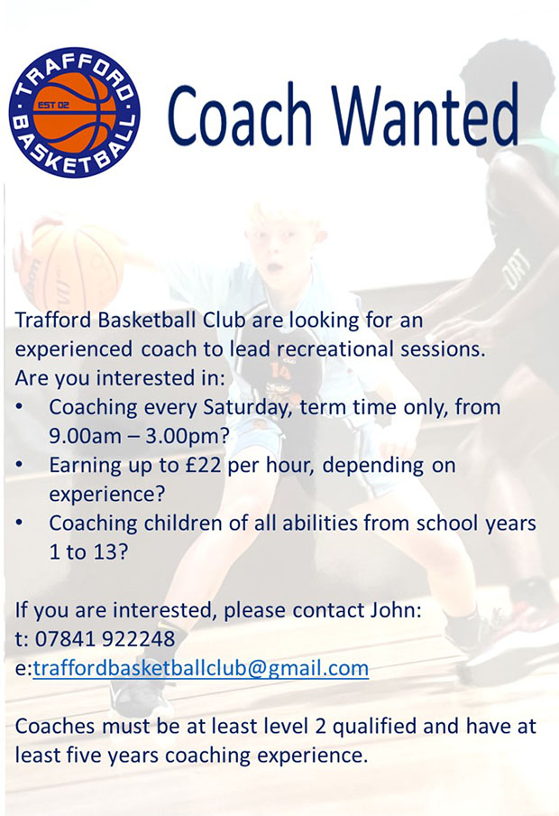 Read More ...Trafford Basketball Club are looking for an experienced coach to lead recreational sessions. Please contact John on 07841 922248 or email traffordbasketballclub@gmail.com to apply.